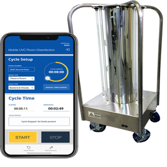 The American Ultraviolet MRS33-8 Mobile UV Unit quickly disinfects medium to large spaces like hospitals, offices, schools, gyms, and even public transport. It features eight 33" UVC lamps with a polished reflector for maximum coverage and 360° motion sensors for safety. Control disinfection cycles via WiFi from your phone or tablet with preset or manual timing options. Compact enough for emergency vehicles. Warning: Room must be vacant during use.